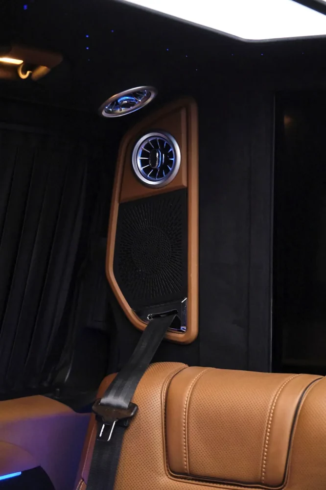 This Mercedes V300 VVIP facelift it has superior amenities. It comes with extra rear AC and comfortable air suspension for premium travel. The interior it has very clean tan leather seats, special trim, and full functioning premium lights, making every journey perfect.