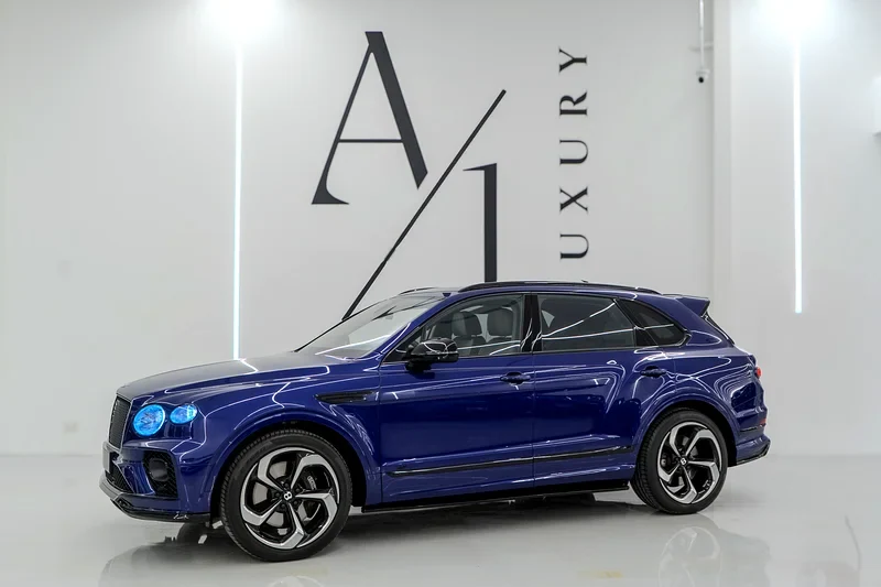 Bentley Bentayga S SUV bleu foncé a très bon look, puissance moteur fort et conduite silencieuse. Climatisation souffle froid, suspension se sent solide. Paiement crypto c'est bon.