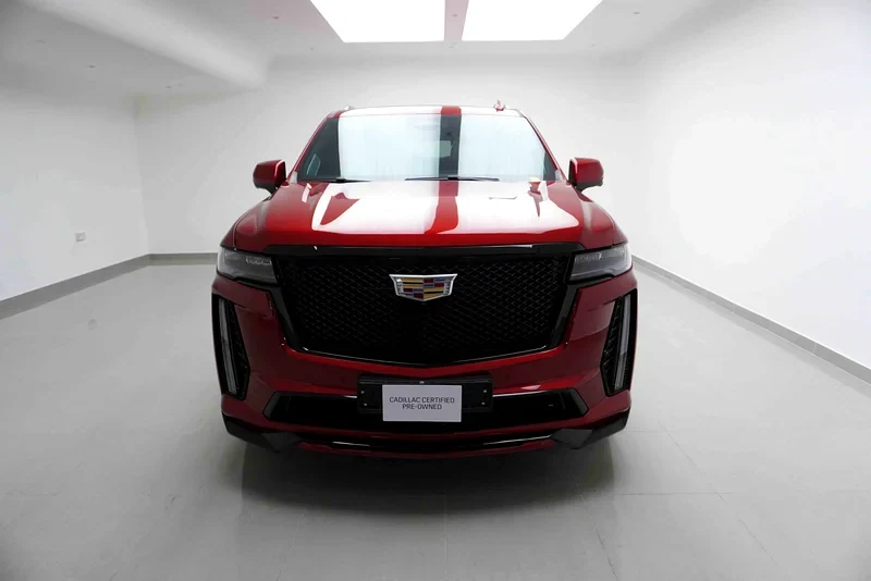 Ce Cadillac Escalade V-Series a puissance fort et roule stable sur autoroute. On check toutes les pièces; air condition froid et freins sont forts. Voiture regarde presque neuf, avec sa peinture rouge premium et roues spéciales V-Series.