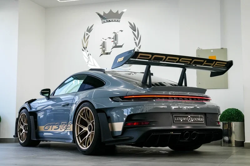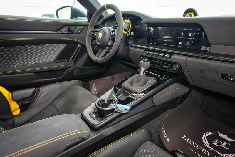 Intérieur avec cuir doux, tout fonctionne bien, y compris les sièges, l'écran, les capteurs. Cette Porsche GT3 RS Weissach a des roues dorées uniques. Son design puissant la rend très spéciale.